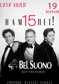 В 2026 году Шоу трех роялей Bel Suono, отмечает своё 15-летие грандиозным юбилейным туром.Южно-Сахалинск, ул 2-я Центральная, 1Б (ТРК Сити Молл). Сити Холл - Концертный зал 19 февраля, 19:00 - 21:00-